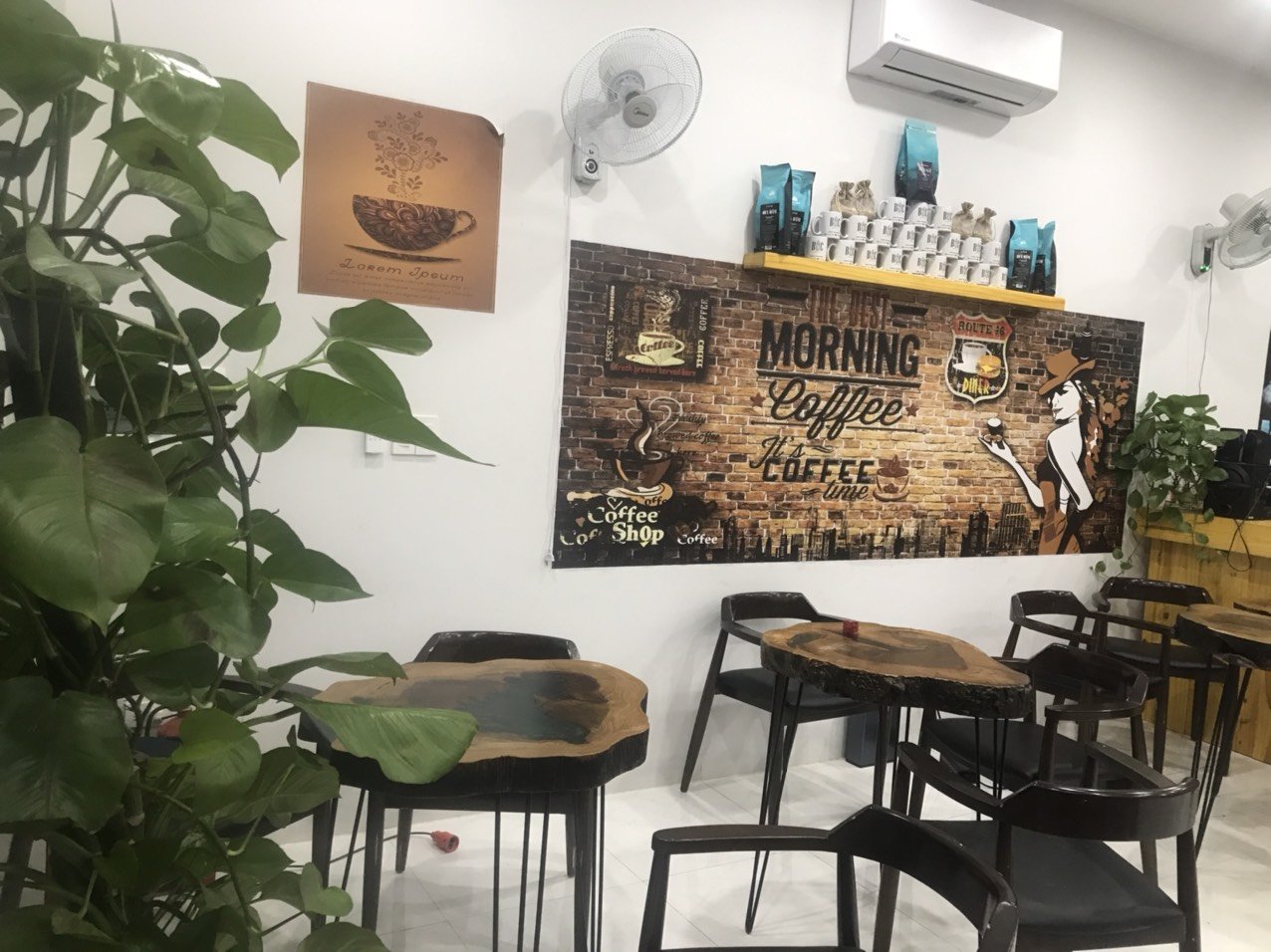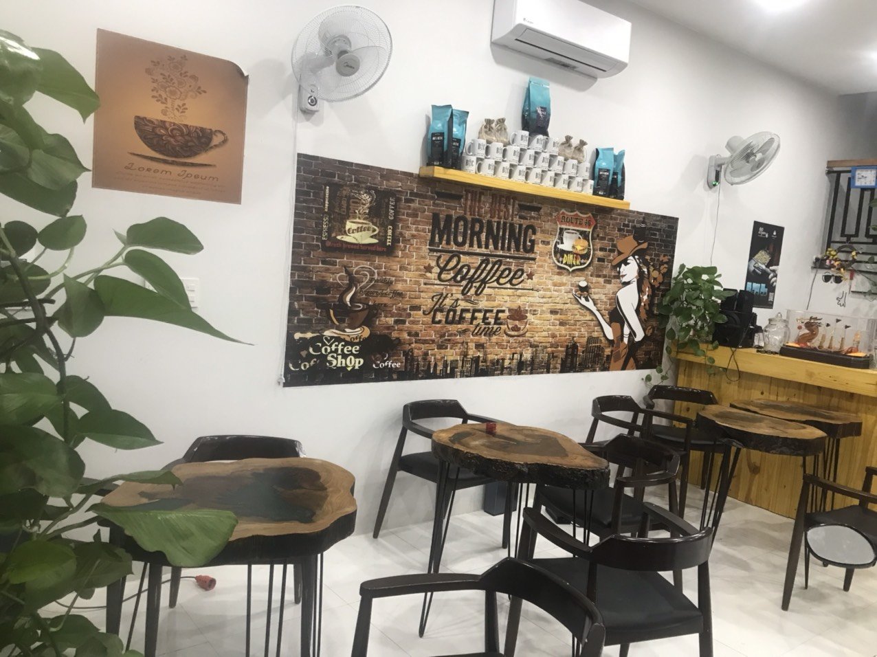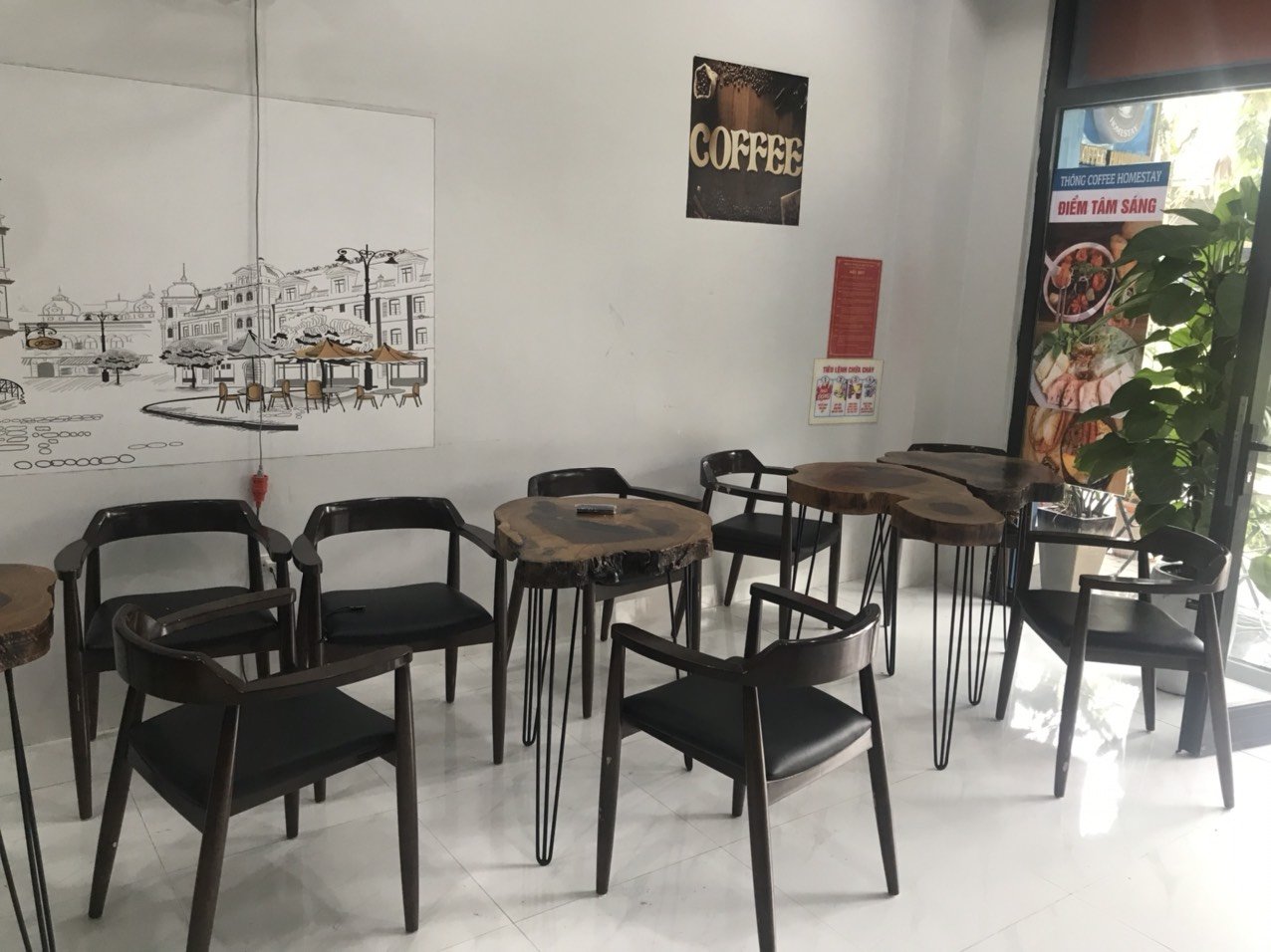 Tầng 1: Bàn ghế cafe, bếp đầy đủ thiết bị
