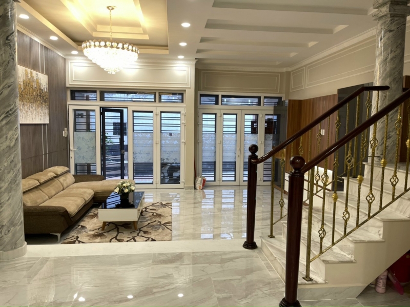 Diện tích 6,4m x18m ( nở hậu) công nhận 115m2 đất, nhà trệt 3 lầu 2 sân thượng, 5 phòng ngủ rộng, 6wc, phòng thờ, phòng kho, sân vườn, giếng trời….